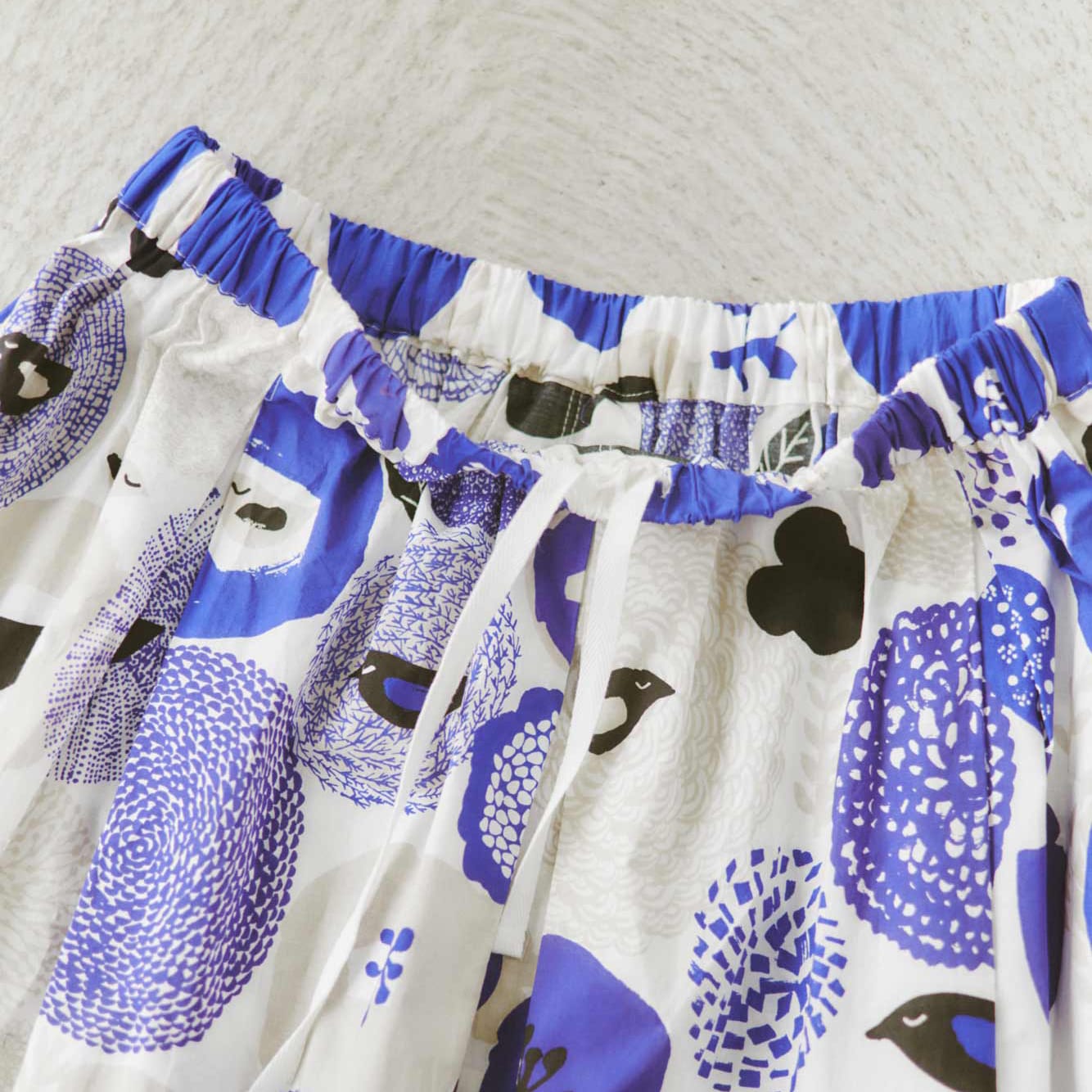 ギャザーを寄せたウエストはゴム仕立てで