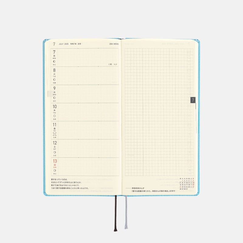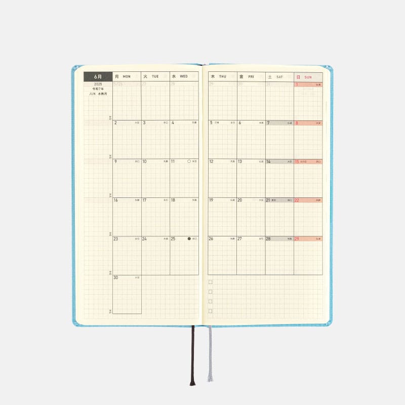 ■記載される内容: 週番号/六曜(大安、仏滅など)/二十四節気(立春、春分、夏至など)/祝日、記念日など(バレンタインデー、ひなまつり、母の日、父の日など)/月の満ち欠け(週間ページ全てに記載・月間カレンダーに満月と新月のみ記載)