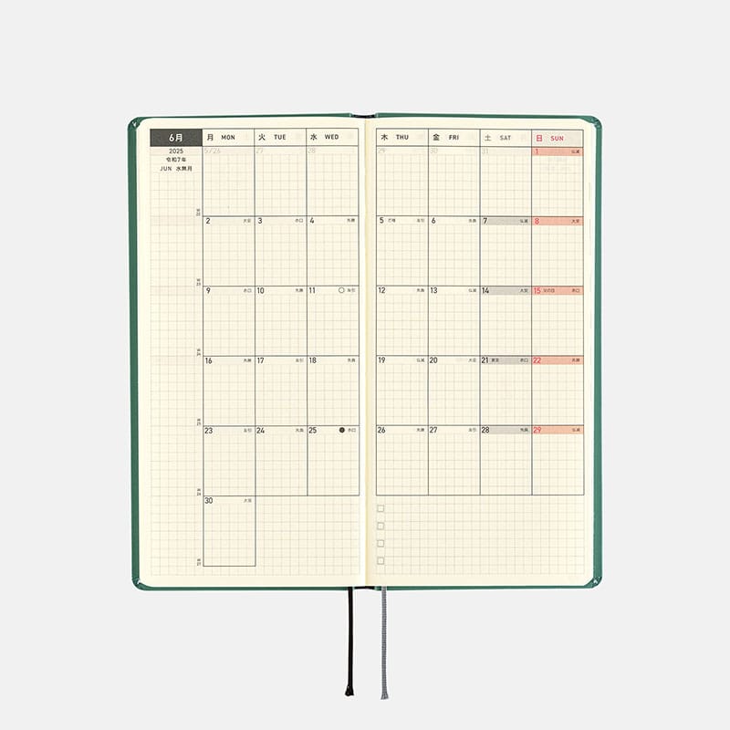 ■記載される内容: 週番号/六曜(大安、仏滅など)/二十四節気(立春、春分、夏至など)/祝日、記念日など(バレンタインデー、ひなまつり、母の日、父の日など)/月の満ち欠け(週間ページ全てに記載・月間カレンダーに満月と新月のみ記載)
