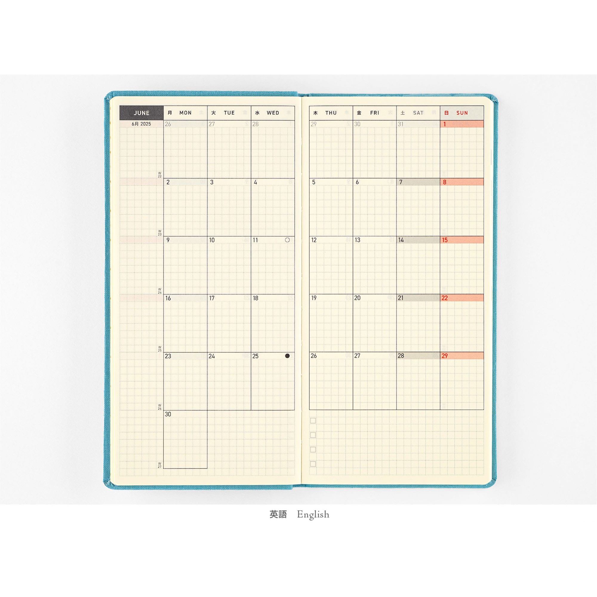 ■記載される内容:週番号/月の満ち欠け(週間ページ全てに記載・月間カレンダーに満月と新月のみ記載)