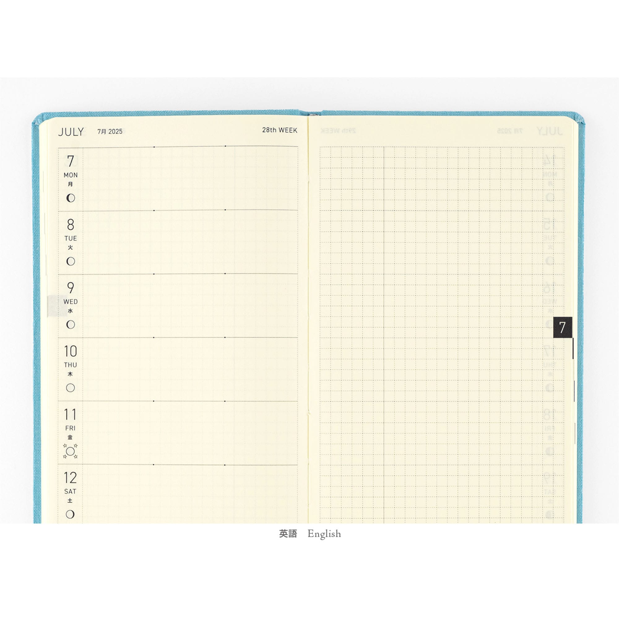 ■記載される内容:週番号/月の満ち欠け(週間ページ全てに記載・月間カレンダーに満月と新月のみ記載)
