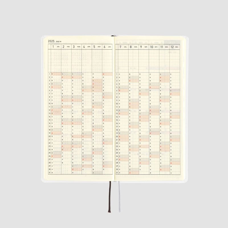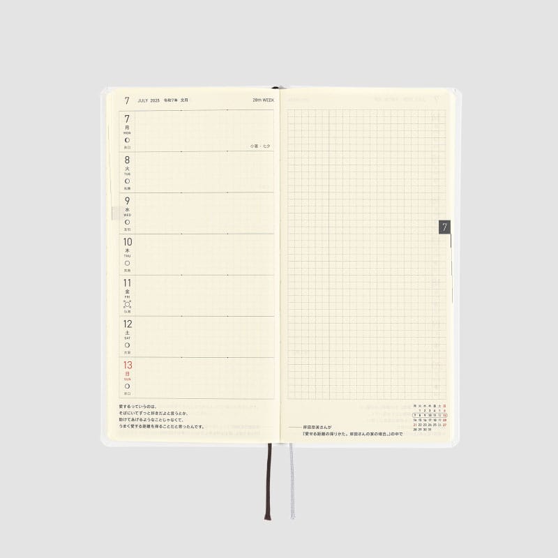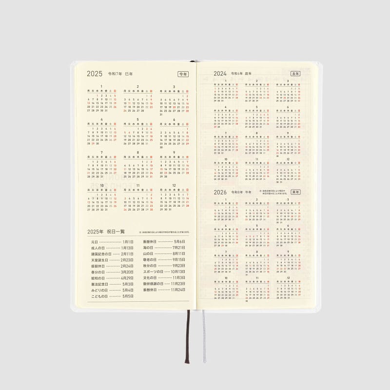 ■記載される内容:週番号/六曜(大安、仏滅など)/二十四節気(立春、春分、夏至など)/祝日、記念日など(バレンタインデー、ひなまつり、母の日、父の日など)/月の満ち欠け(週間ページ全てに記載・月間カレンダーに満月と新月のみ記載)