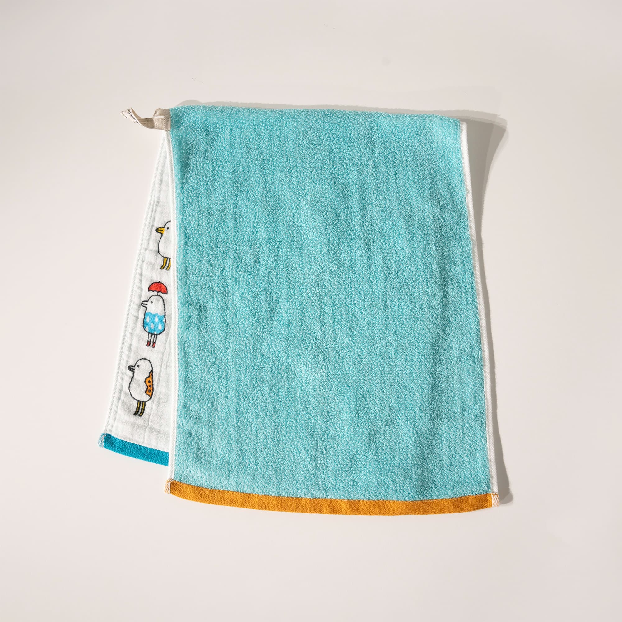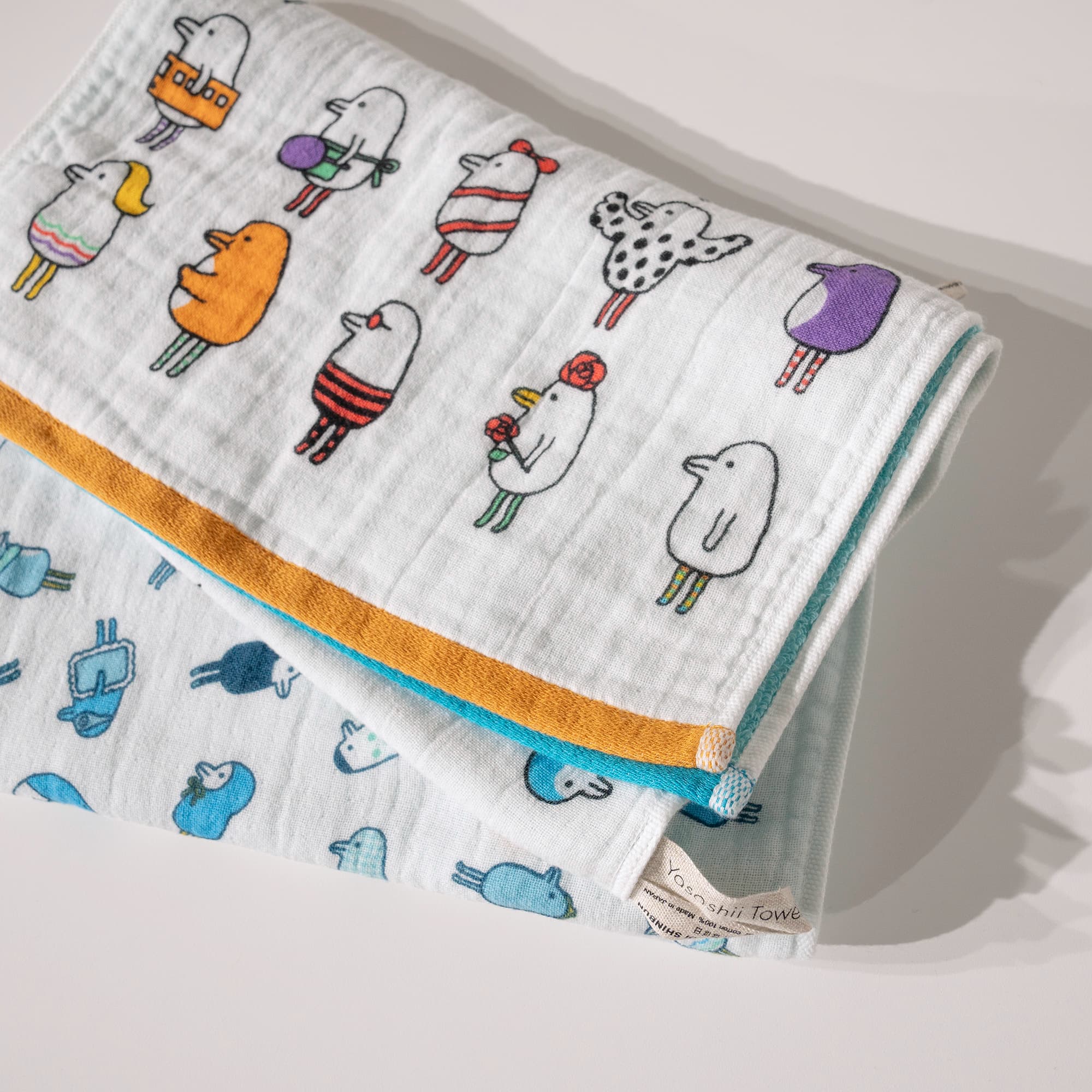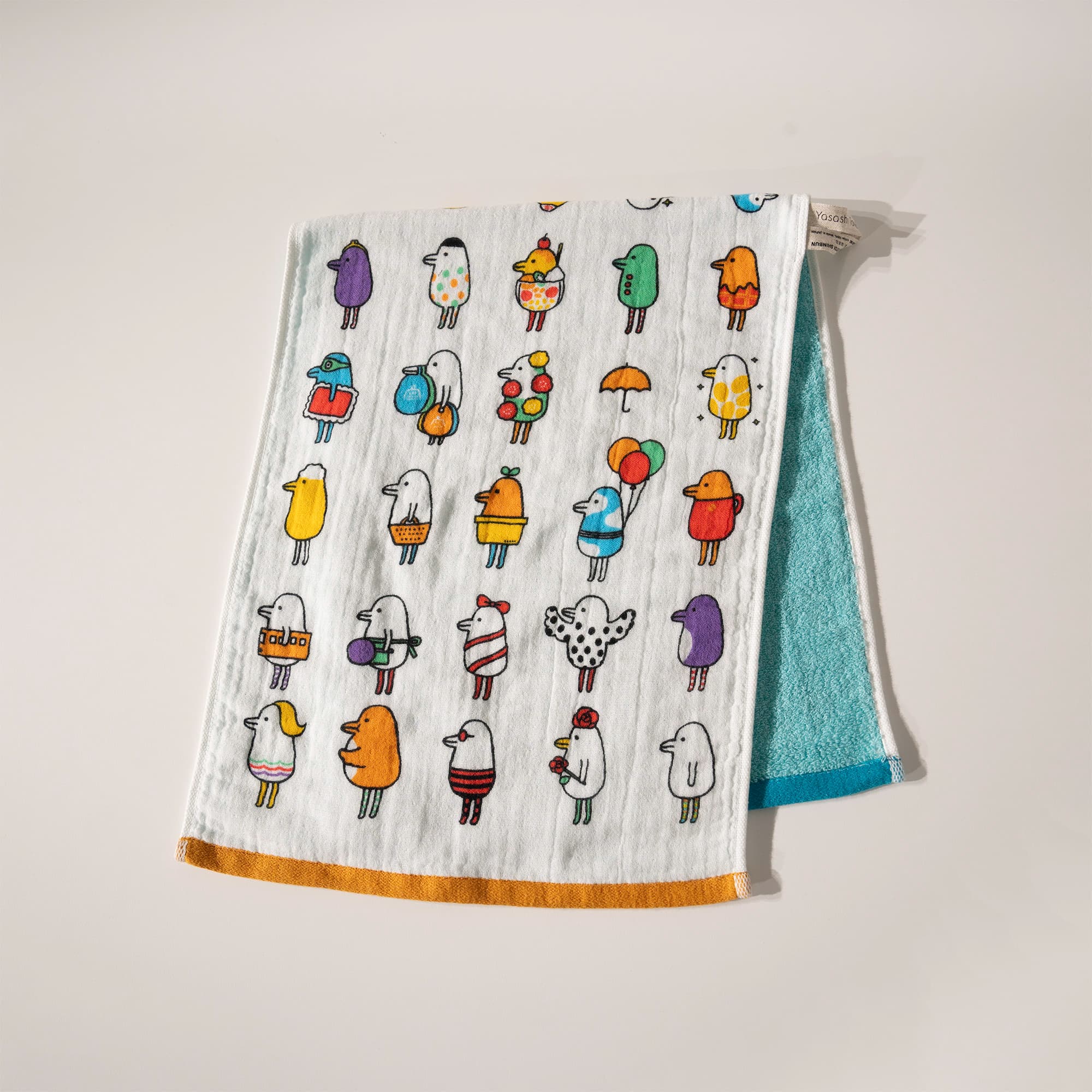・プリントのタオルは、使い始めに色落ちしたり、染料のニオイがすることがあります。白物と一緒に洗わないでください。