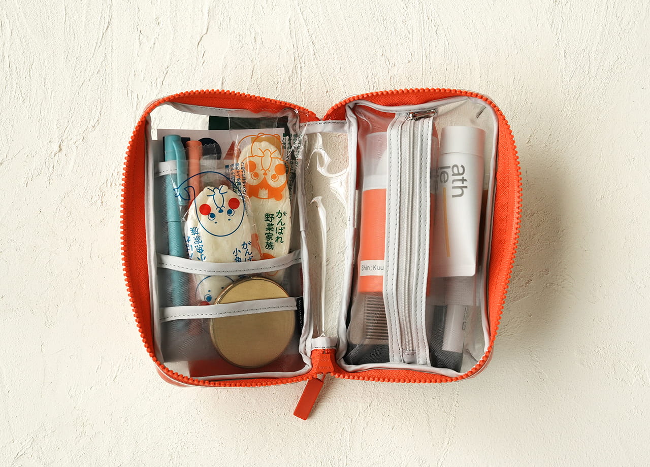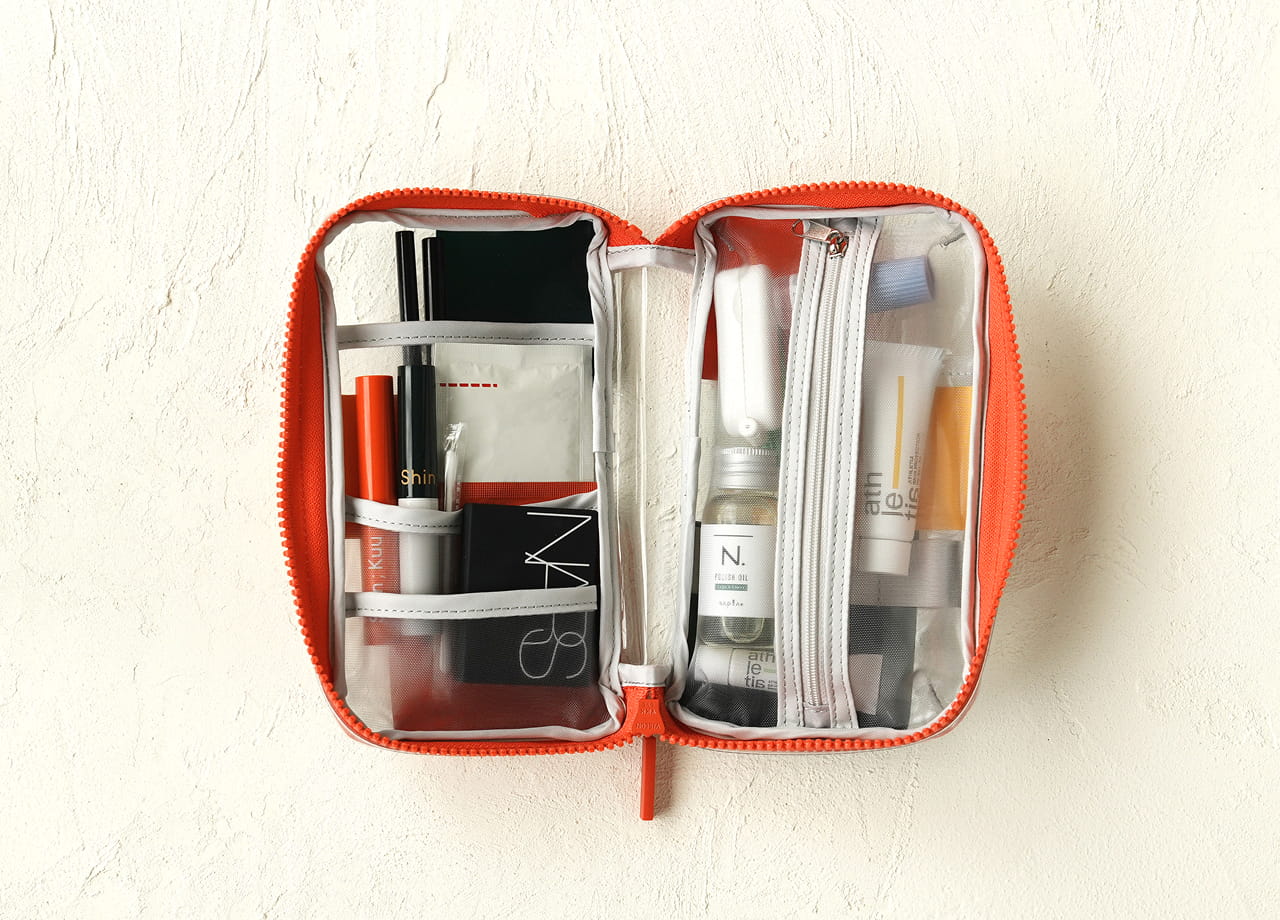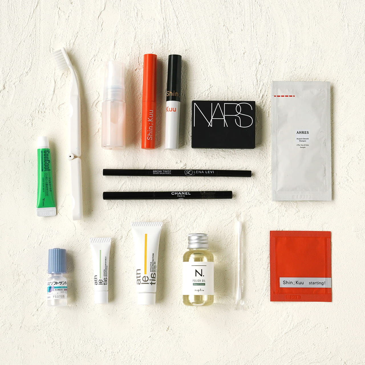 歯磨きジェル/歯ブラシ/Shin;Kuu セラムウォッシュ(トラベルボトルに入れて)/Shin;Kuu バームスティック シンク/Shin;Kuu レディー ミー コンシーラー/プレストパウダー/アイブロウペンシル/アイライナー/シャンプー、トリートメント(パウチ)/Shin;Kuu スターティング(パウチ)/綿棒/ヘアオイル/日焼け止め/目薬