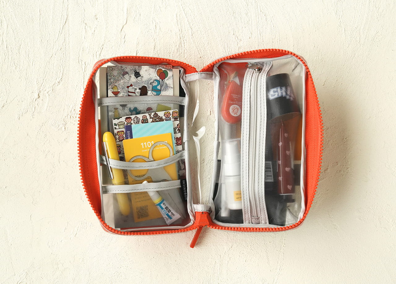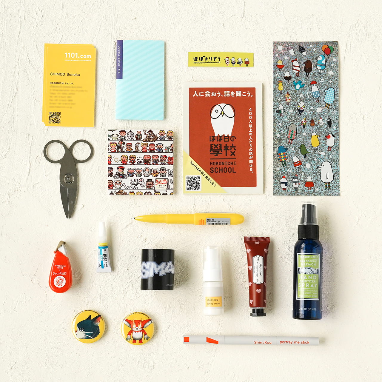 名刺/手帳ばさみポケットセクレタリ/ほぼ日の両面テープ/MOTHERのメモ帳/ほぼトリドリシール(上の黄色い部分と下の部分を切って入れています)/消毒液/ハンドクリーム/HIGHTIDE ペンコ バレットボールペン ライト 0.7mm/Shin;Kuu スプリングクリーム(ミニスターターセットから)/Shin;Kuu ポートレイ ミー スティック #05/MOTHERの「SMAAAASH!!」YOJOテープ/『ひみつストレンジャー』の缶バッチ/瞬間接着剤/デコラッシュ ONE PIECE 麦わらの一味