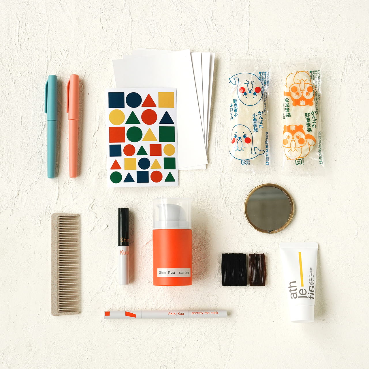 蛍光ペン/シール/紙/おせんべい2個/手鏡/日焼け止め /ヘアゴム/Shin;Kuuスターティング/Shin;Kuuポートレイ ミー スティック#02、#04/Shin;Kuu バームスティックコンシーラー/ヘアコーム