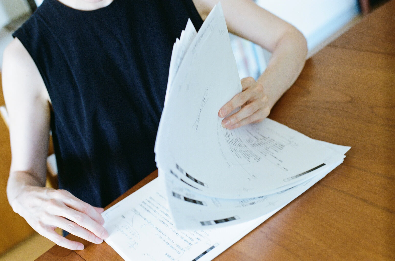 片岡さんがその言葉を見つめながら文章を書いていて。