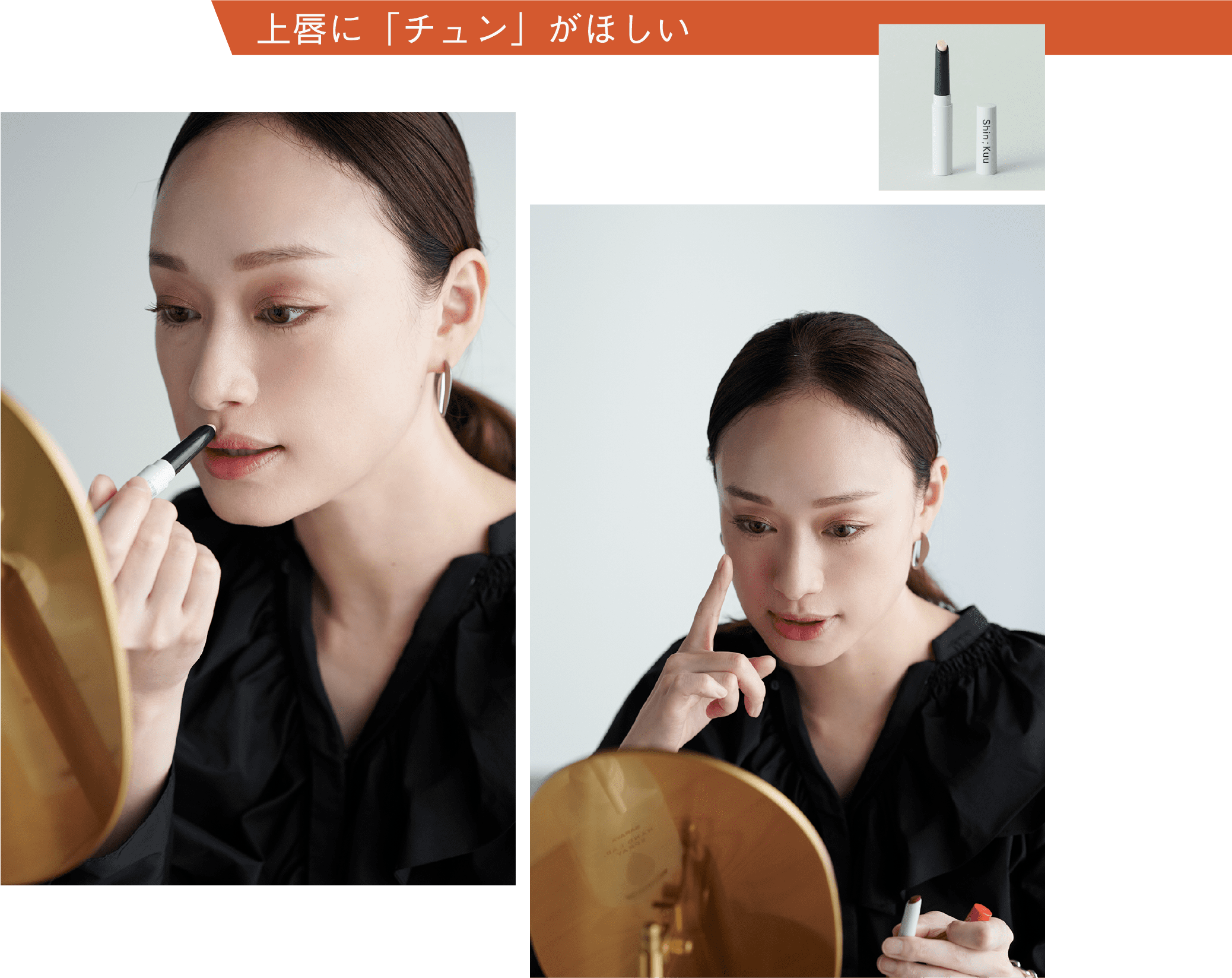 上唇のV形のくぼみに直接塗って、自然なツヤを足すと、