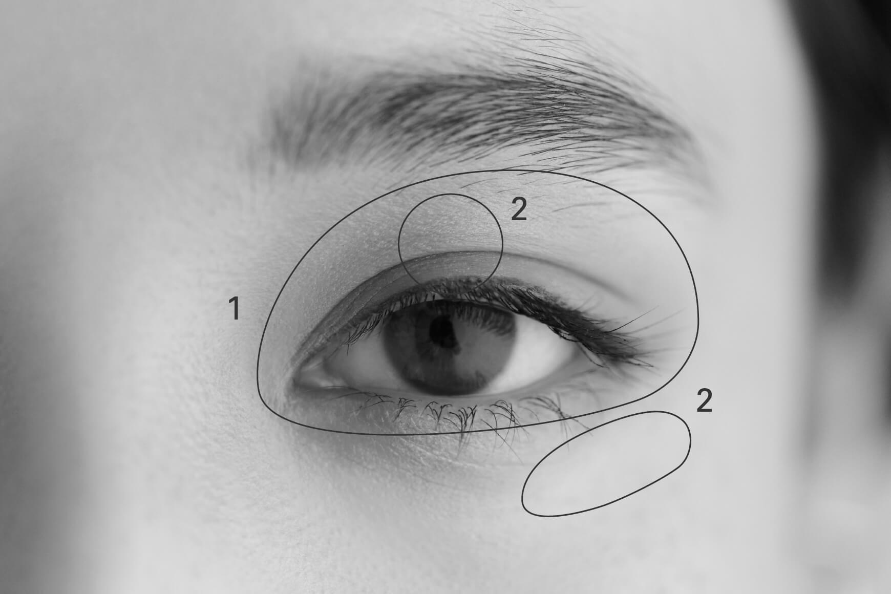 1.シンク、コントロール、シェードを手の甲に同量取り出して混ぜ、まぶたの上下に塗る。