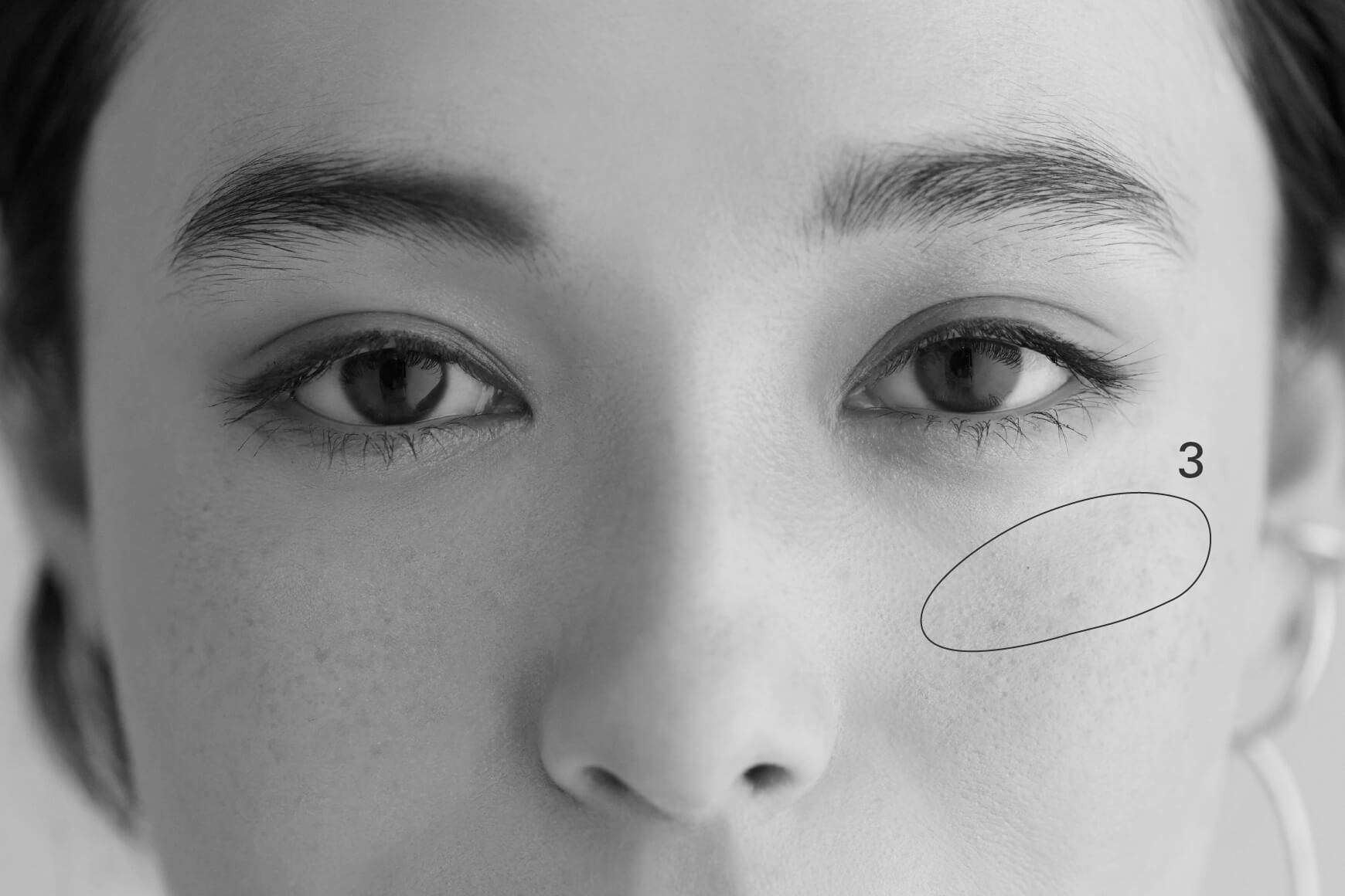 2.黒目の上、目尻の下のほお骨の高い位置にライトをのせて、軽く押さえて肌になじませる。