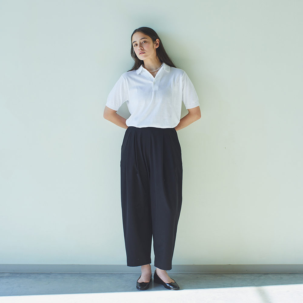 ベーシックカラーのネイビー艶のあるパンツをあわせました。