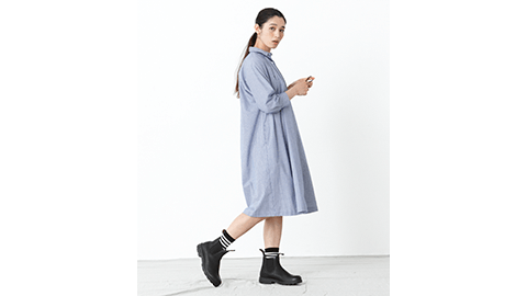 さわやかな白と青。小さな襟、台襟がきちんとついた襟もとの前後の身頃に細かいタックが入っています。裾に向かって、きれいなドレープをつくりながら、 たっぷり、ふんわりとひろがるシルエットです。このワンピース、肩の位置が自由なラグラン袖ですが、袖つけがちょっと不思議。前から見ると袖つけの縫い目がありません。前身頃から袖ぜんたいが、一枚の布で包まれて、縫い目は後ろ身頃に。だから、ギンガムの柄が途切れることなく、きれいに続いているのです。