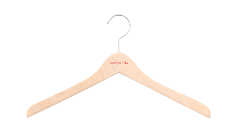 大橋歩さんが書いた「hobonichi + a.」のロゴ入りの、天然木・無塗装のオリジナルハンガーです、創業60年を超える、専門の工芸会社さんに制作を依頼。肩のライン、長さ、厚み、素材など は すべて大橋歩さんといっしょに決めました。ハンガー(レディス)より少し大きめの 男性サイズ、ハンガー(メンズ)も用意しました。今回販売する洋服には、トップスにはハンガー、ボトムスにはズボンかけが1着につき1点、「ほぼ日スト ア」の特典としてついています。