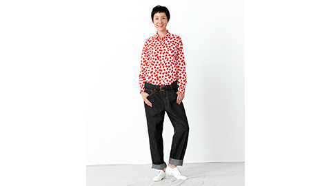 白地に、元気な赤。踊るようなランダムなみずたまの布地は、大橋さんがひとつひとつ切り絵をして、並べ、デザインしたオリジナルプリントです。シャツのかたちは、オーソドックス。ほどよい大きさの角襟で、台襟もあり、肩ヨークもついています。裾はゆるやかにカーブがあって、ボトムにインでも、アウトでも。タイトめに着ても、大きめのサイズをゆったり着ても、どちらもカッコよく決まります。布は薄手で肌触りのよい、上等なブロードです。