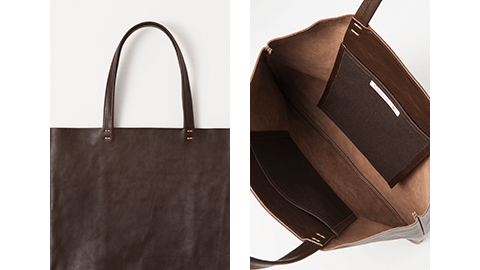 大橋歩さんプロデュースのもと、靴の職人である櫻井義浩さんが、手仕事でていねいに仕上げた革のトートバッグです。靴づくりの技術をいかし、かばんづくりでは、ふつうはしないような細かな工程を経て完成しました。パソコンもすっぽり入る大きさです。革は、イタリアの革工房、NUOVAGRENOBLE社のもの。100%植物タンニンなめし法という伝統的な手法を守り、革本来の表情をなるべくいかせるように、加工は最低限に抑えています。牛革のなかでも、柔軟な肩の部分のみを使っています。