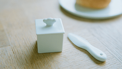 フタの取っ手が、くまの顔になっているバターポットにあわせて使うバターナイフです。バターポットに使うぶんだけバターを入れ、おなじ波佐見焼のぽってりしたバターナイフをそえると、いつもの食卓が、ちょっとたのしくなります。ジャムポット、ジャムスプーンといっしょにお使いいただくのも、おすすめです。バターポットは、ジュエリーそのほか、小物入れとしてお使いいただいても、べんりです。