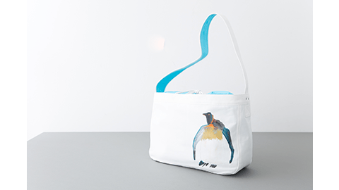 ミロコマチコさんのペンギンの絵をフロントに大きくあしらいました。帆布の色は、きなりではなく、真っ白。中身が飛び出さないようにひもでしばる巾着タイプのふたをつけました。内部には小物を整理するのに便利なポケットもついています。肩から下げるスタイルが基本ですが、ホックをとめれば手持ちもOK。アクセントカラーはブルーとグレーの2種類を用意しました。丈夫で、大容量。国内生産。ぜひ、この夏の相棒にしてください。