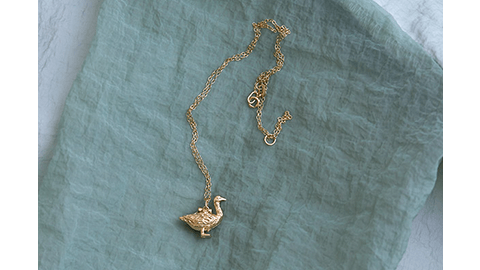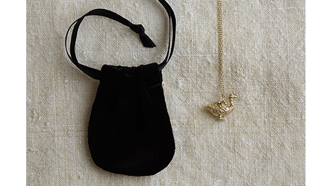 イソップ寓話の「The goose and the golden egg」をモチーフにした、ハンドメイドの仕掛け付きペンダントです。9カラットの金製で、名の通り「黄金の卵」ががちょうの中に隠されている遊び心あるひと品です。両側の瞳には天然のダイヤモンドをあしらいました。当品には、ロンドンの貴金属監査法人The Goldsmiths’ Companyによる厳しい金の品質検査に合格したことを証明する刻印が入っています。高級感のある別珍の巾着に、特製ジュエリーボックス、お手入れに使えるジュエリークロス1枚とともにお届けします。