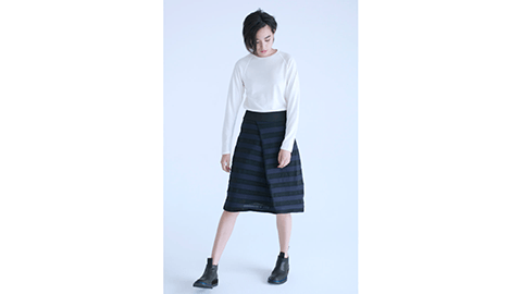 ブラックとネイビーのボーダースカート。軽いニットで編まれているので身につけたとき、柔らかい素材ならではのふんわりとした動きが出ます。「ボリューム感を持たせるために、前身頃の部分を折り返しているのではいたときに、ちょっとしたアクセントになります。ボーダー部分は、実は表地と裏地。交互に凹凸の出る編み方になっています。ウエスト部分はニットでなく布帛なのできちっとはくことができます」(デザイナー渡邉良重)