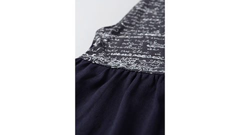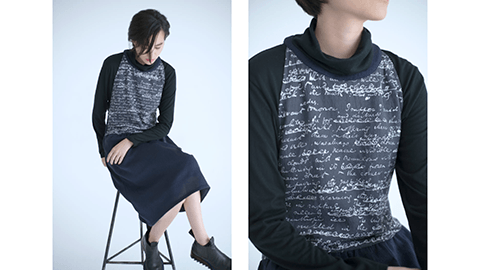 軽い着ごこちの、ニットのワンピースです。前身ごろにプリントされた文字はイギリスはヴィクトリア朝時代の小説家、チャールズ・ディケンズの小説「クリスマス・キャロル」の草稿から。「ワンピースはいろいろつくってきましたが、これははじめてのかたちです。脇が大きく開いているのでゆったりしていて、着やすいと思います。下には、白いシャツでもいいしグレーのハイネックのカットソーなんかにも合わせてみたいですね」(デザイナー渡邉良重)