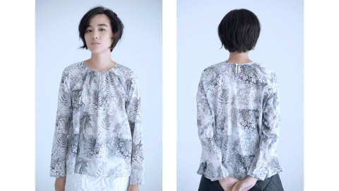 春夏で反響の高かった、ラグランのブラウス今秋冬では、長袖バージョンが登場。「前回、とても着やすかったので、秋冬も着たいなと思ってつくりました。グラフィックはふるい図鑑にあるような植物の絵柄を描いたり組み合わせたりしました。襟元にはギャザー、着たときに裾が広がるシルエットです。秋冬なのでタートルネックを合わせてもいいかもしれませんね」(デザイナー渡邉良重)