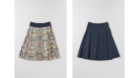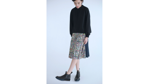前面いっぱいにプリントされた花柄は、いろいろなレースペーパーをカットしマジックで着色したものを再構築して作った柄です。まるでアートワークを身にまとう感覚のこれぞCACUMA、という一着。「前身ごろ、後身ごろともにランダムにプリーツを入れています。シワになりにくい素材なので何かを気にせず、どんどんはいてほしい。華やかな前身ごろ、黒一色の後ろ身ごろ。そのコントラストが、気に入っています」(デザイナー渡邉良重)