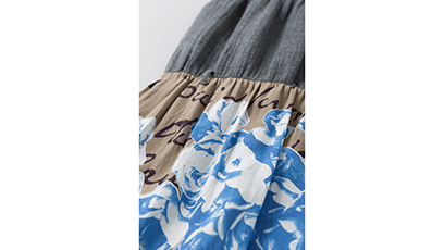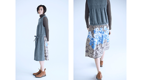2014年の秋冬に販売して大好評だった「ギャザーワンピース」をリニューアルしました。前回は表裏で着こなせる仕様でしたが今回は「後ろ身ごろ柄」に。「ディケンズの小説の文字に、わたしが撮ったつるバラの写真を重ねました。下はTシャツでも、ブラウスでも。ウエストはたくし上げず、腰のあたりですとんと落として着るのがいいと思います。ベルトは共布でつくりました」(デザイナー渡邉良重)