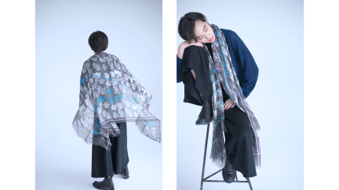 大きくて、軽くて、あたたかい。一年を通じて大活躍の大判ストール。極細の糸を使用しているため軽くて、たたむとかなりコンパクトに。一年中、カバンに入れて持ち歩けます。秋冬シーズンだけでなく、冷房の効いた部屋や飛行機の中など重宝する場面は、予想以上に、たくさん。「今回は、ユリのモチーフです。そこへ、青とピンクのラインを入れてデザインを締めました。個人的には今回のデザインが、いちばん好きかな。1枚1枚手刷りでプリントしています」(デザイナー渡邉良重)