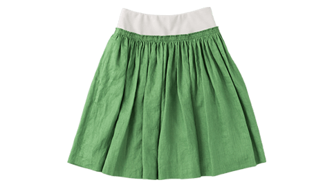 CACUMA定番アイテムの麻のギャザースカート。回を重ねるごとに改良を加えてきました。「今回は、ちょっとだけ、丈を短く。このスカートは、ウエストではいても、腰に下げてはいてもいいんです。そうすることで丈の長さも微妙に調節できます。派手さを抑えた黄緑なので実際にはいてみると、見た目の印象より自然に着られると思います。ウエストをストレッチ素材にすることではいたときのボリューム感を抑えています」(デザイナー渡邉良重)