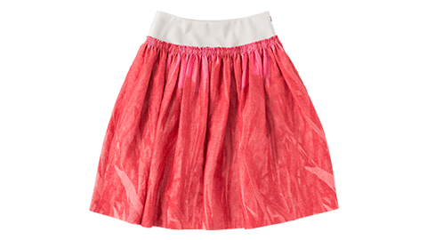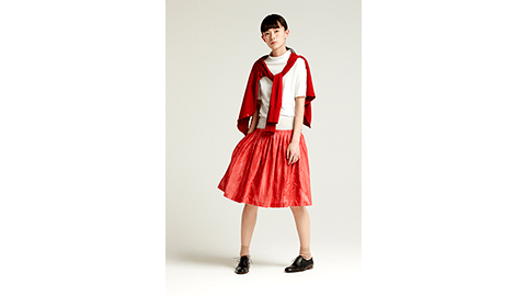 CACUMA定番アイテムの麻のギャザースカート。回を重ねるごとに改良を加えてきました。「今回は、ちょっとだけ、丈を短く。このスカートは、ウェストではいても、腰に下げてはいてもいいんです。そうすることで、丈の長さも微妙に調節できます。草のプリントのスカートと同じ写真を表面にプリントしています。派手すぎない赤なので、じつは、はく人を選ばない色だと思います。ウエストをストレッチ素材にして、はいたときのボリューム感を抑えています」(デザイナー渡邉良重)
