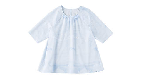 2013年の春夏にはじめてお目見えした、ラグランのブラウス。着やすさと女性らしいシルエットでたいへん好評です。今季は、後ろ身ごろのパターンに余裕をもたせました。胸元には、ギャザーが入っています。涼しげに着られる、淡い海色のブルー。袖は、五分丈。半袖よりは長く、肘が隠れるくらいです。