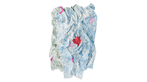 毎回、大人気の大判ストール。幅約85cm × 長さ約200cmの大きさなのに非常に細い糸で織られているためカバンに入れて持ち歩くことができます。渡邉良重さんならではのボールペンによる「ラクガキ」です。川の水面を思わせる涼しげな色あいに、赤いバラなどのモチーフがポイント。これを、一枚一枚、職人さんが手で刷る「手捺染」 で印刷しました。「このストール、一年中持ち歩いています。飛行機の中や映画館など夏でも冷房が効きすぎているような場所ですごく重宝するんです」(デザイナー渡邉良重)