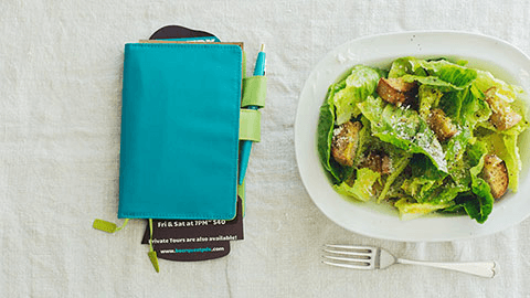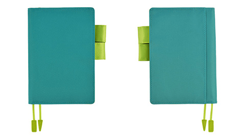 光沢のある明るいブルーグリーンは、毎日の喜怒哀楽をぜんぶ受け止めてくれそうなさわやかでやさしい色合いです。一転、中面の目の覚めるような黄緑は、手帳を開くたびに気分を高めてくれそう。相反する二つの雰囲気がひとつになって、ふしぎとしっくりなじむカバーです。
