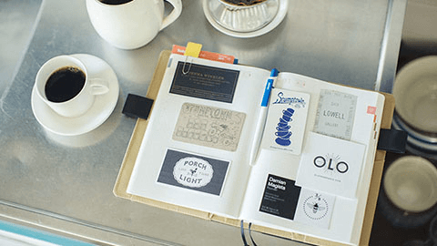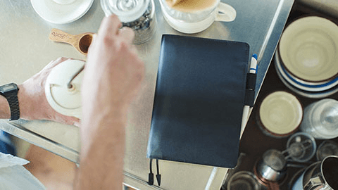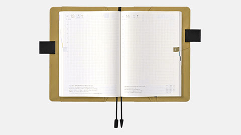 「ブラック×ベージュ」は、外観はシックなブラック一色の手帳。しかし中面を開いてみると、イエローオーカーとも呼ばれる、濃いめのベージュ。光沢があることで、カジュアルさのなかにも品のある印象になりました。ピシッと締まった感じにやわらかさの加わったカバーは、ビジネスとプライベート、両方の要素をたっぷり書き込めるカズンにぴったりです。