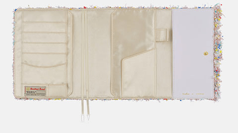 シャンパンゴールドの毛糸を基調に、レッドやブルー、エメラルドグリーンの羽根がアクセントとなっています。エレガントでありながら、かわいい印象も持ち合わせています。持ち歩くたびにスパンコールがキラキラと光るのもポイントです。手帳を留めるゴールドのスナップボタンに刻印された「Coohem」のロゴにもご注目ください。