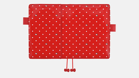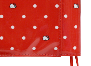 70年代に展開していたクラシックなキティちゃんを、ドット柄のなかに散りばめたカバーです。表面にはラミネートコーティングをほどこし、なつかしいキティグッズのような雰囲気を出しました。内側のポケット部分には、シャボン玉で遊ぶ懐かしい色合いのキティちゃんがプリントされています。また、しおりの先についているキティちゃんのリボンもポイントです。かわいらしさのなかに大人っぽさもあるので、年齢を問わずに使っていただけるカバーです。