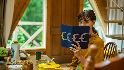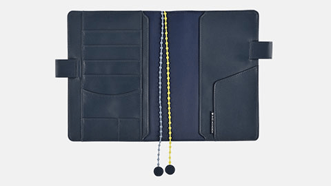 大きな翼を広げて羽ばたく鳥たちを手描きの図案をもとに、4色の刺繍で表現しました。鳥の目や羽の向きに沿ったカーブの部分など細かなところにまでていねいな仕事のぬくもりが感じられます。刺繍が映える紺色の生地には目の粗いざっくりとしたリネンを選び内側やバタフライストッパーには少し光沢のある明るい紺色の合皮を合わせました。ぽこぽことした立体感のある2色のしおりひもは、刺繍の技法で作られた特別なもの。「ミナ ペルホネン」の世界を刺繍ならではの立体感や手触りとともにたのしんでいただけます。