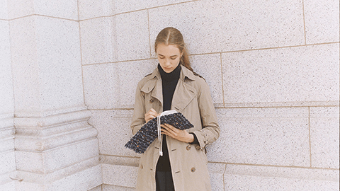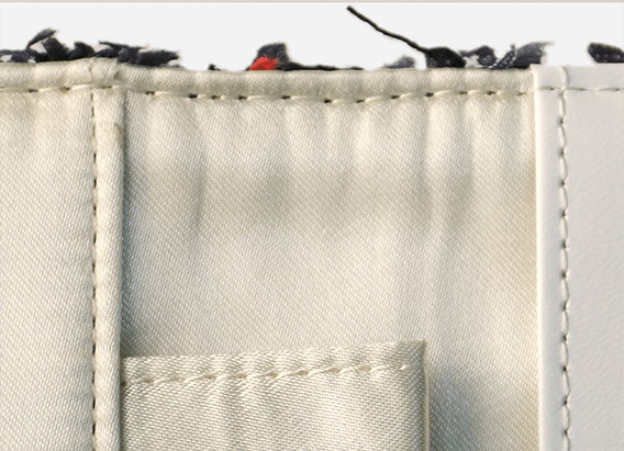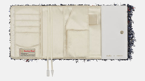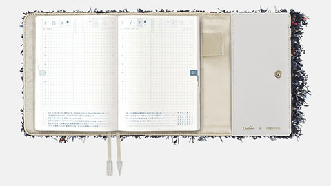ニットブランド「Coohem(コーヘン)」と3つ折りタイプのカバーを作りました。上質な「ツイードジャケット」をイメージし、カバーの端にはフリンジをつけ、内側は洋服の裏地のようなサテン生地をあしらっています。手帳にジャケットを羽織らせたようなカバーです。