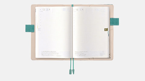 ボーダーと複雑な模様が重なった「Marinière(マリニエール)」は、trois tempsの作るトートバッグのなかで人気ナンバーワンの柄なのだそうです。手織りの温かみとともに、ミントグリーンのさわやかな色合いと美しいボーダー柄がマリンテイストも感じさせます。ポケット部分はさらにミントグリーンの縦縞が加わっているので、手帳の表と裏で違った表情が楽しめます。