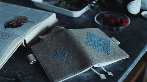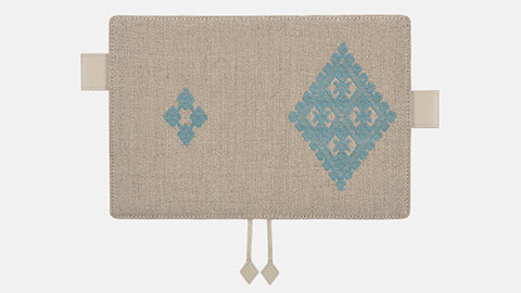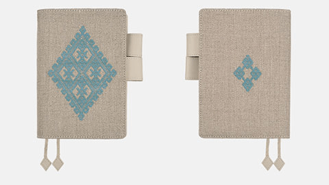 青森県・津軽地方に江戸時代から伝わる刺し子刺繍の「こぎん刺し」を、布芸展(ふげいてん)の束松陽子さんと福田里香さんが現代のファッションとしてプロデュースし、弘前こぎん研究所の刺し手さんが一針ずつ刺繍して作ったほぼ日手帳カバーです。「もどこ」と呼ばれる模様にはそれぞれ意味があり、「てこなこ」はちょうちょを意味する津軽弁で、羽を広げてお花にとまっている情景を表しています。裏表紙は印象を変えて、花の首飾りをイメージした「花つなぎ」と呼ばれるもどこを刺しました。麻のリボンの先端には、もどこをイメージした菱形のチャームもついています。麻と木綿の肌触りの変化もたのしめる、味わい深いカバーです。