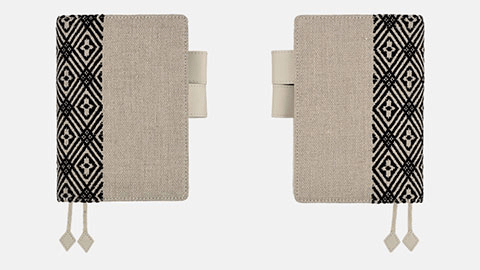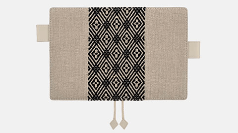 青森県・津軽地方に江戸時代から伝わる刺し子刺繍の「こぎん刺し」を、布芸展(ふげいてん)の束松陽子さんと福田里香さんが現代のファッションとしてプロデュースし、弘前こぎん研究所の刺し手さんが一針ずつ刺繍して作ったほぼ日手帳カバーです。「もどこ」と呼ばれる模様にはそれぞれ意味があり、「うろこ」は魚のうろこに由来していて、大輪の花のように並んだ魚のうろこ柄が背表紙を包み込むように刺されています。麻のリボンの先端には、もどこをイメージした菱形のチャームもついています。麻と木綿の肌触りの変化もたのしめる、味わい深いカバーです。