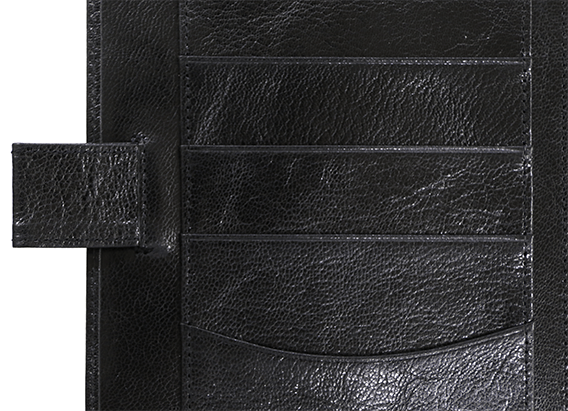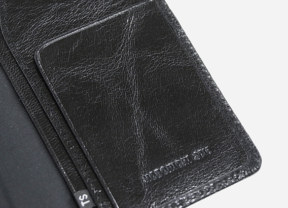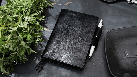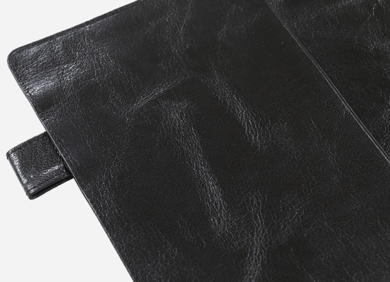 2009年の登場以来上質な黒革カバーとして人気の高い「TSブラック」に新しいラインナップが加わりました。グラフィックデザイナーの佐藤卓さんが選んだのはツヤツヤとした光沢のあるゴートスキン(山羊革)。牛革やシープスキン(羊革)に比べてシボやしわが多く表情も豊かで、しなやかなのが特長です。丈夫で摩擦にも強いことから、昔から本を装丁するための高級素材としても使われてきました。一つひとつしわの入り方が異なる革本来の魅力を、たっぷり味わえるカバーです。(「TS」は、佐藤卓さんのイニシャルです)