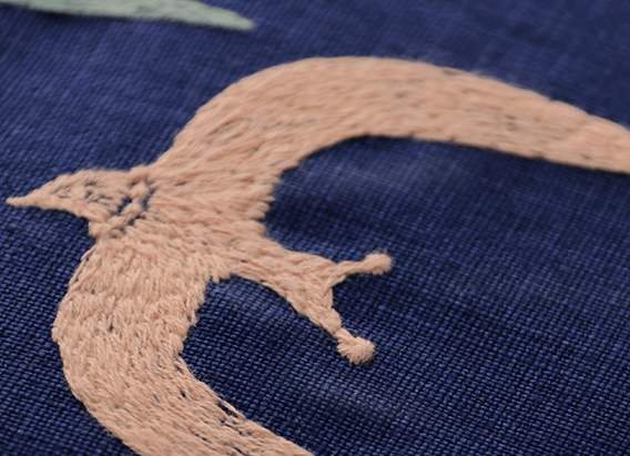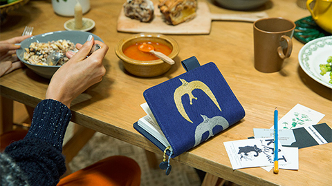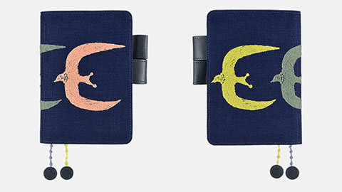翼を大きく広げた3羽の鳥が連なる「go!」。手描きの図案をもとにした刺繍のカバーです。鳥の目や、羽の向きに沿ったカーブの部分など、細かなところにまでていねいな仕事のぬくもりが感じられます。ベースの生地は、目の粗いざっくりとしたリネンで内側やバタフライストッパーには少し光沢のある明るい紺色の合皮を合わせました。ぽこぽことした立体感のある2色のしおりひもは、刺繍の技法で作られた特別なもの。「ミナ ペルホネン」の世界を刺繍ならではの立体感や手触りとともにたのしんでいただけるカバーです。