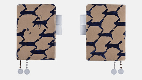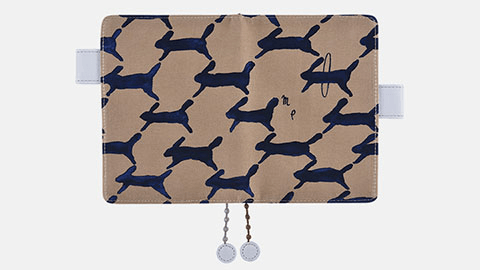 うさぎたちがいっせいに走るようすが格子模様のようにも見える「ミナ ペルホネン」の人気テキスタイル「run run run」から生まれた手帳カバーです。ずっと触っていたくなるようなやわらかくてなめらかな布地にプリントしました。ベージュ地に紺色の組み合わせはほぼ日手帳のためだけのオリジナルの配色です。水彩の手描きイラストをもとにしているためよく見ると、1羽1羽のうさぎのそれぞれに個性が。また、紺色の染料を数版に分けて刷っているからこそ微妙な濃淡が表現されています。内側には、明るくさわやかな水色の合皮を使い刺繍の技法で作られたしおりひもを合わせました。