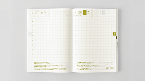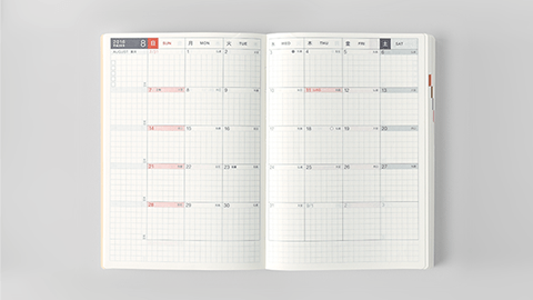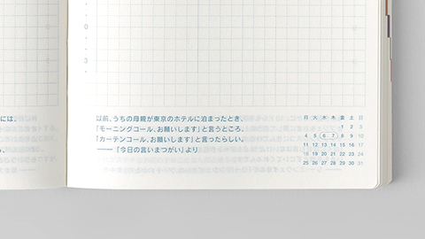 スペースがたっぷりある「1日1ページ」タイプ。書きやすさを追求して行き着いた「3.7ミリ」の方眼は、印刷を薄くしてあるので、マス目を気にせずに使うこともできます。予定を書くだけではなく、写真やチケットを貼ったり、絵を描いたり、ノート代わりにメモしたりするなど、自由に使えるのが特長です。