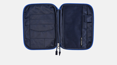 表側のさわやかなブルーはスポーティーな印象。内側の深みのあるネイビーとのコントラストがきれいです。男女と、幅広い年齢層に使っていただけるデザインになっています。