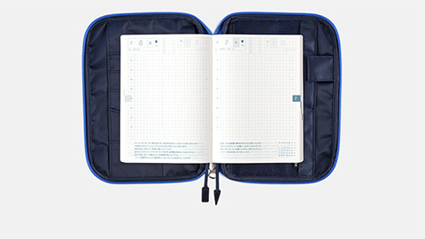 しおり(2本)/ペンホルダー(1つ)/カード用ポケット(3つ)/スマイルポケット(1つ)/小さなポケット(1つ)/大きなポケット(2つ)/メッシュポケット(1つ)/外側ポケット(1つ)