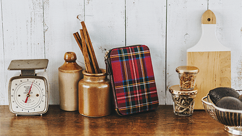 レッドを基調に、ブルーやイエロー、ホワイトなどのラインが入った明るい色彩のチェック柄。「Royal Stewart」(ロイヤル・ステュワート)と呼ばれるこのデザインの生地は、英国女王陛下の衛兵が着用し、時代を超えて愛されるクラシックなデザイン。マフラーやストールでも人気の柄です。ジッパーズの背に施された革ともしっくりなじみ、男女問わずお使いいただけます。