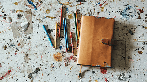 使うほどに手になじんでゆく、なめらかな感触の上質な革を使ったアンリークイールのカバー。一つひとつイタリアの工房で、ハンドメイドでつくられています。