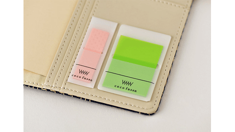 また、ココフセンならではの特長が、ケース裏面が粘着シールになっていて好きな場所にケースごと貼って使えること。WEEKSなどのポケットの少ない手帳でも、携帯しやすくなっています。